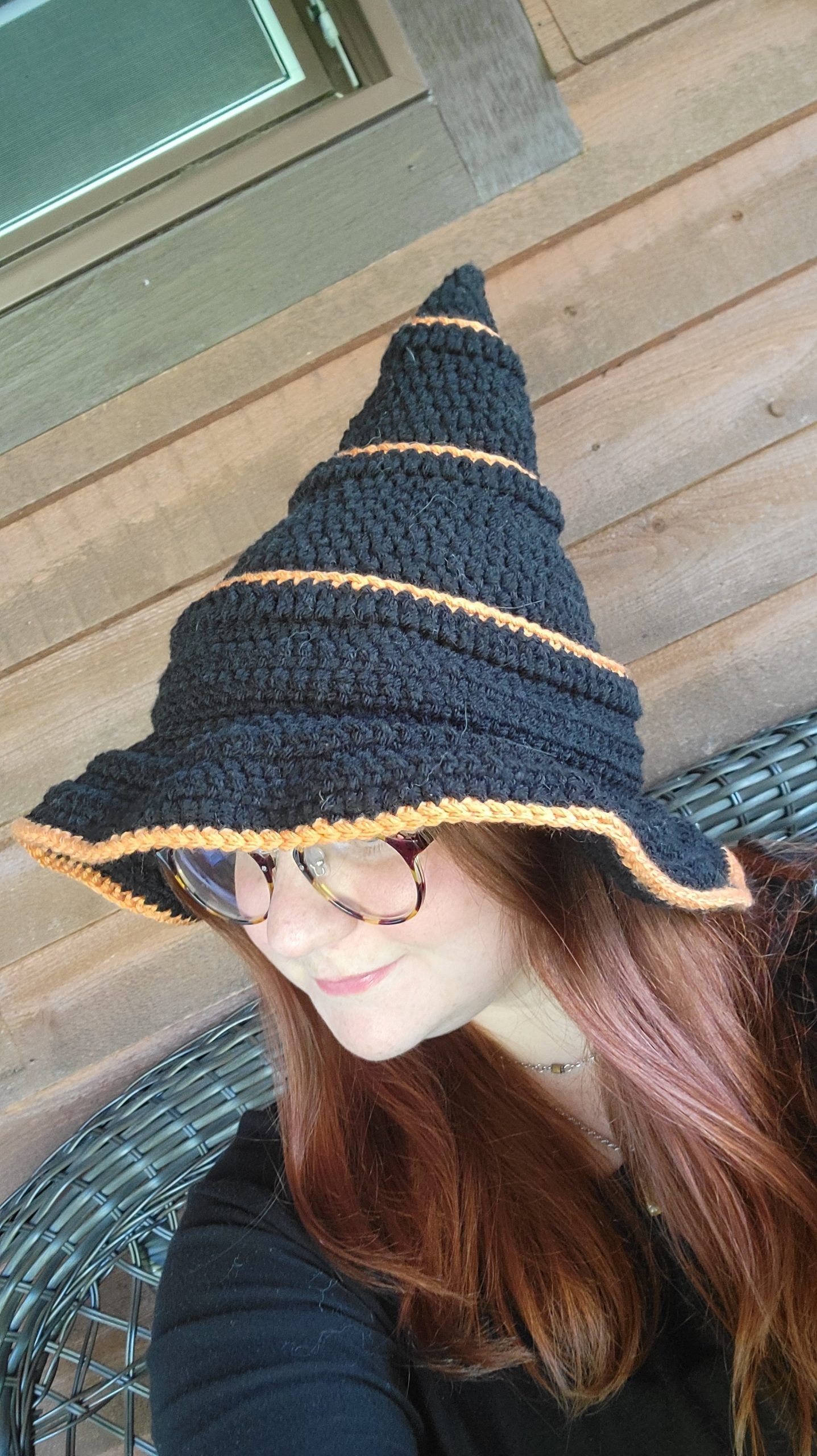 Handmade by Shyla, this Large Striped Witch/Wizard Hat is a statement piece full of cozy charm and bold magical energy. The soft crochet construction gives it bendable, expressive character, while the striped pattern adds personality and style. Perfect for costumes, festivals, witchy décor, photoshoots, and everyday magic. Choose from a variety of colors for your perfect look.